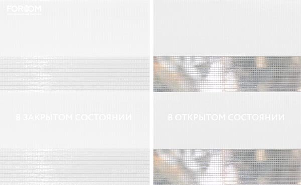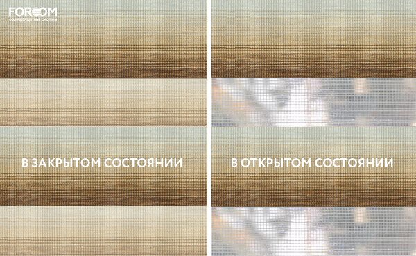 Полотно ткани, состоит из чередующихся горизонтальных полос – прозрачных и непрозрачных. Изменяя положение этих полос относительно друг другу, можно создать целых 3 режима регулировки светом. Например, чтобы в помещении стало светлее, нужно расположить прозрачные полосы друг напротив друга. Если разместить прозрачную и непрозрачную полосу параллельно друг другу, то можно добиться практически полного затемнения.